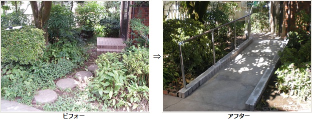 • エクステリアの段差                                        エクステリアの階段をスロープにすることで転倒の危険を少なくできます。スロープにできない場合は、  段数を増やし1段1段の高さを抑えましょう。